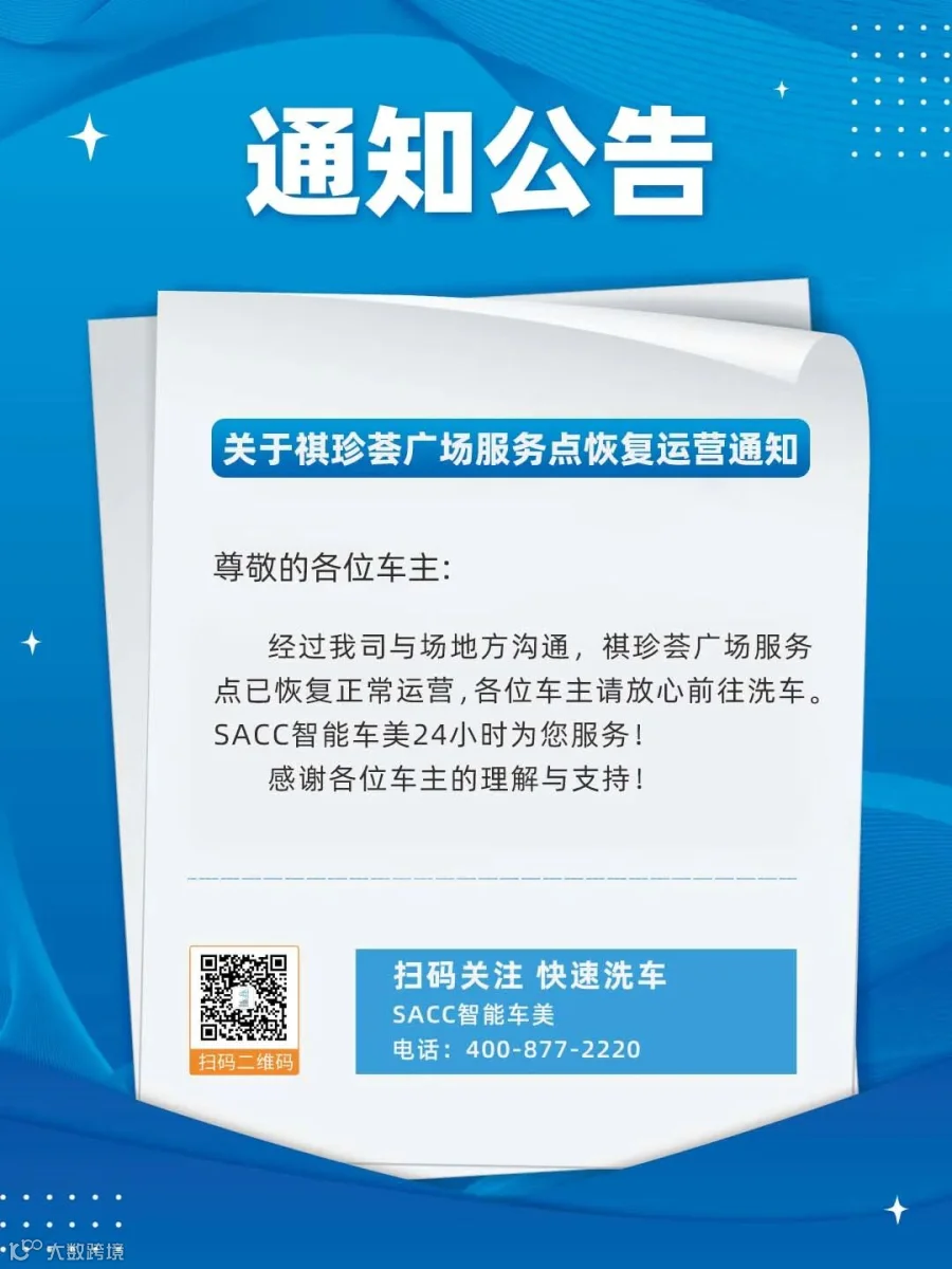 SACC智能车美 | 祺珍荟广场服务点恢复运营通知