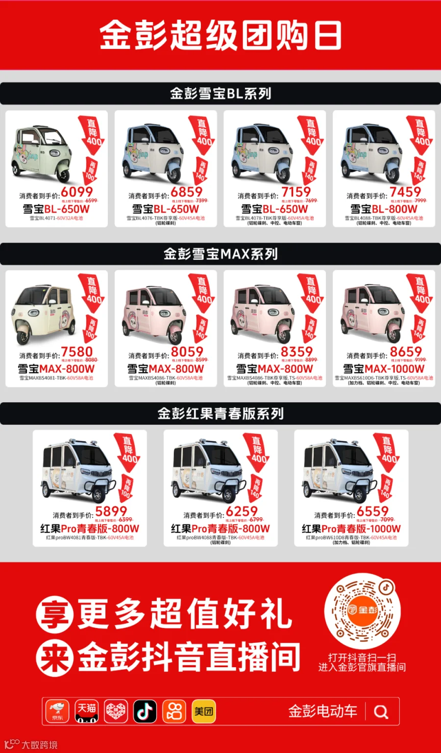 金彭超级团购日年终最后大促,用实力定义行业标杆,以匠心产品为根基,以真诚服务为初心,每一份坚守都只为不负用户信赖!上抖音,搜金彭,解锁购车超值福利,共启科技出行新体验,书写行业新篇章!