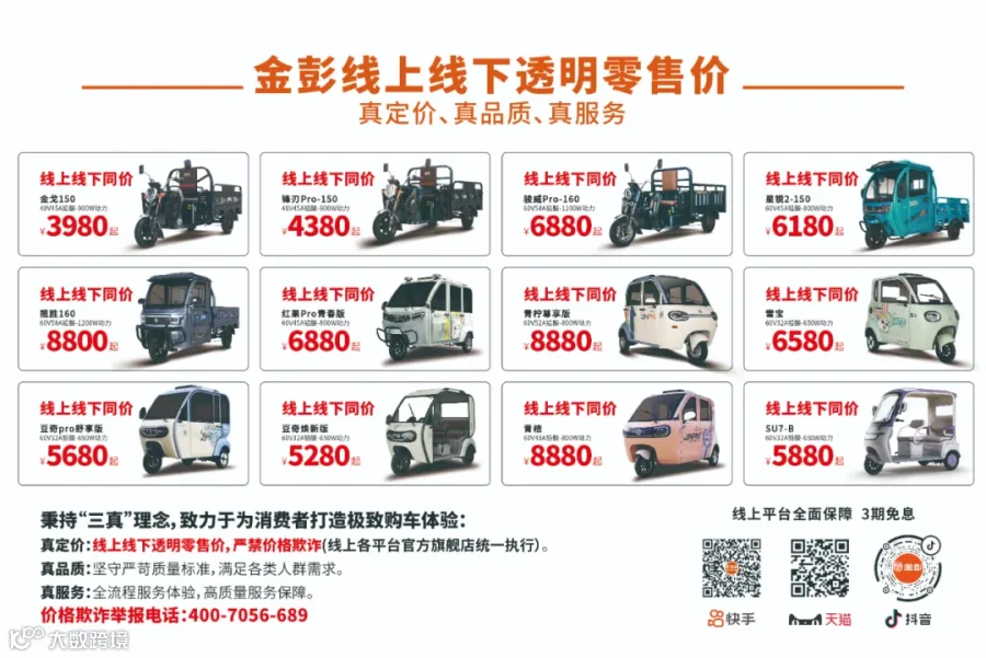 为进一步提升消费者购车体验,金彭电动三轮车即日起在全国范围内推行 "线上线下透明零售价" 体系。
