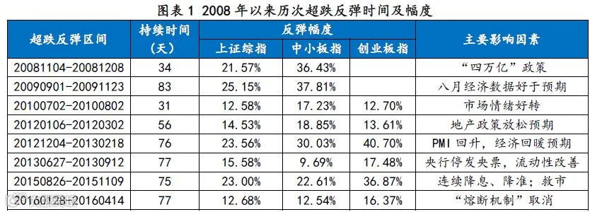 从2008年以来的8次A股超跌反弹来看,导致市场反弹的原因大都与宏观经济政策或宏观经济预期有较大的关系,历次超跌反弹持续时间约1-2个月,上证综指的反弹幅度在15%-25%之间。