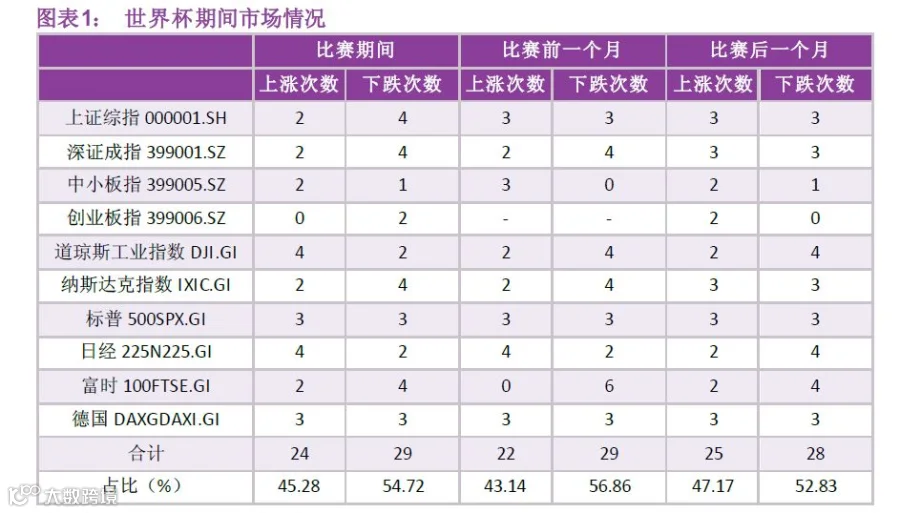 但是对于股市来说一直有种世界魔咒的说法,我们来看下数据,世界杯期间及前后,股市下跌次数稍多于上涨次数。近6次世界杯所考察的十个股票指数,比赛期间45.28%上涨,54.72%下跌;比赛前一个月43.14%上涨,56.86%下跌;比赛后一个月47.17%上涨,52.83%下跌。