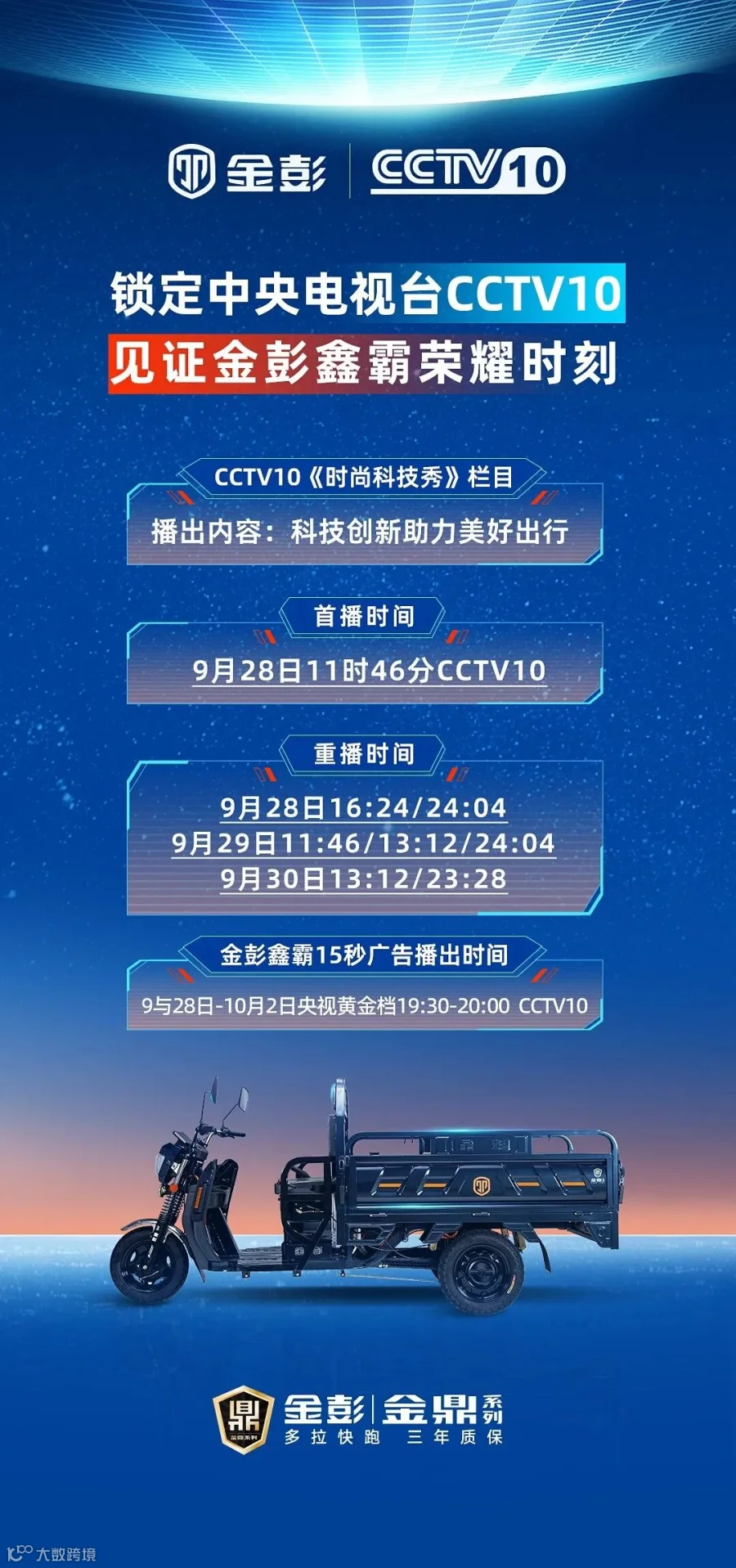 荣登央视CCTV-10《时尚科技秀》栏目。这标志着金彭鑫霸正式亮相央视平台,也代表电动三轮车行业制造水平再上新台阶。