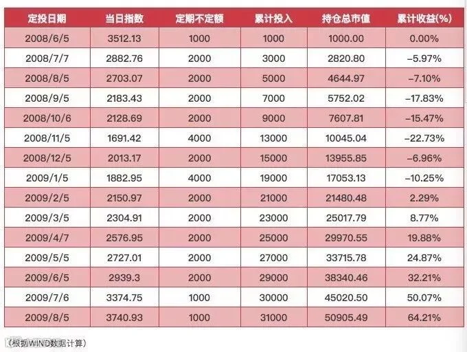 从2008年6月5日至2009年8月5日,沪深300走出了完美的微笑曲线。如果采用定期定额的方法,累计扣款15次,总投入金额15000元,在不考虑交易成本的情况下,最终的持仓总市值为22841元,累计收益高达52.27%。