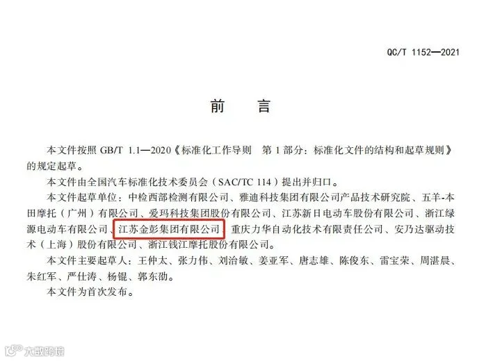 2022年2月1日,由金彭集团参与起草的行业标准化文件——《电动摩托车和电动轻便摩托车用DC/DC变换器技术条件》将正式实施,该标准的实施,与其它零部件标准一起组成了完整的电动摩托车零部件标准体系,对电动摩托车和电动轻便摩托车行业产品的规范、技术的提升和品质的提高具有一定的意义。