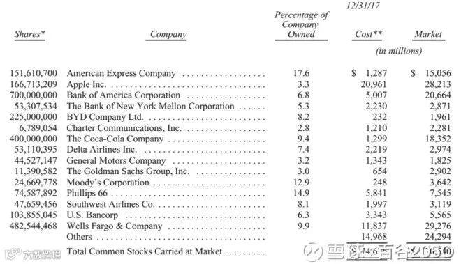 对于所购买的二级市场股票,我们并没有将其看作是基于技术图形、分析师或者媒体评价来交易的股票代码,而是伯克希尔在这些实际业务中拥有的权益。重申格雷厄姆名言:市场短期看是投票机,而长期来看是称重器。
