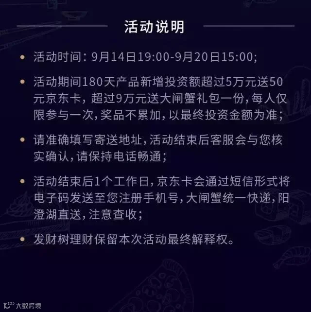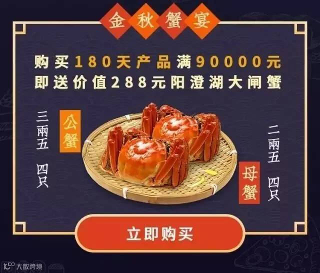 购买180天产品满90000元即可获赠288元的阳澄湖大闸蟹礼盒一份!