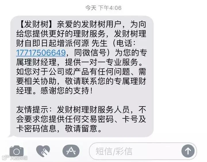 今天很多发财树用户都收到了一条短信,为了提供更好更专业的理财服务,发财树理财特别成立了专属理财经理团队,专门处理用户在理财方面遇到的问题。