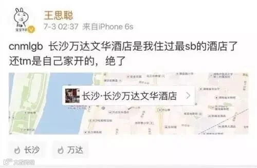 去年7月3日凌晨,因为入住信息被泄露,王思聪在微博上痛骂长沙万达文华酒店。