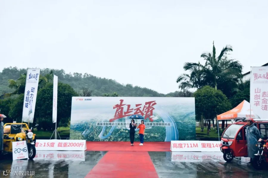 2020年9月17日,秋雨淅淅沥沥,金彭与超威联合发起的“直上云霄——首届电动三轮车骑行节暨重庆横山载重爬坡极限挑战”在重庆綦江横山著名的“九道拐”盘山公路——浸新公路如期举行。此次极限挑战以“载重爬坡”的形式进行,并向全球进行现场直播。在全球近10万观众以及现场嘉宾和20家多家新闻媒体的共同见证下,历经一个多小时的雨中攀爬,最终顺利抵达终点。