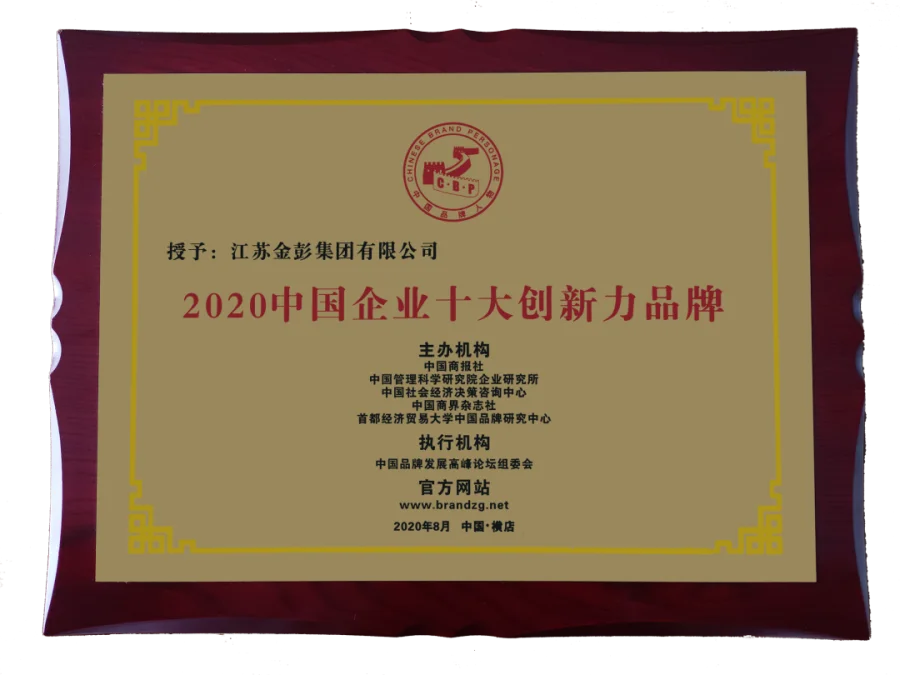 2020年8月27日-29日,由中国商报社、中国管理科学研究院企业研究所、中国社会经济决策咨询中心、中国商界杂志社、首都经济贸易大学中国品牌研究中心共同发起主办的“2020(第四届)中国品牌发展高峰论坛暨中国品牌人物峰会”在浙江横店隆重召开。经过评委会的严格甄选,金彭集团荣获“2020中国企业十大创新力品牌”称号,获此殊荣的还有海尔、安踏等企业。