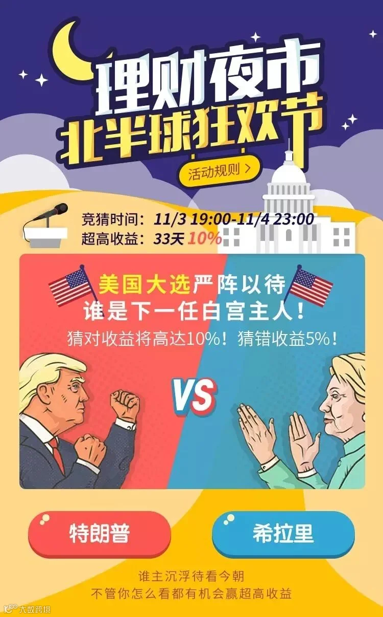 猜对结果将加息至10%,增加的收益将在竞选结果公布后2个工作日以发财币形式提前发放(1元发财币=1元人民币)