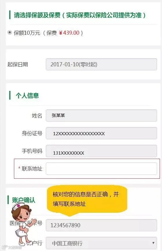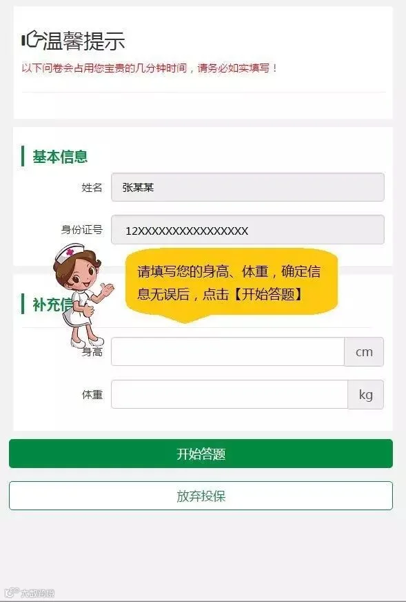 按提示填写姓名和身份证,身高、体重,然后点《开始答题》,一共有五个题目。全部点好后,就点下方的《提交审核》。页面会跳出“您是否确认投保”字样?点“确定”,即会显示“投保成功”。