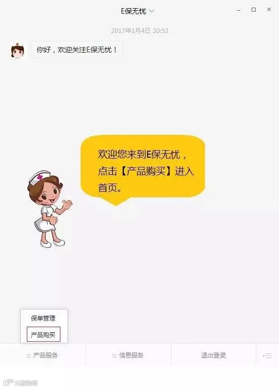 进入其公众号,左下角“产品服务”,再点击“产品购买”