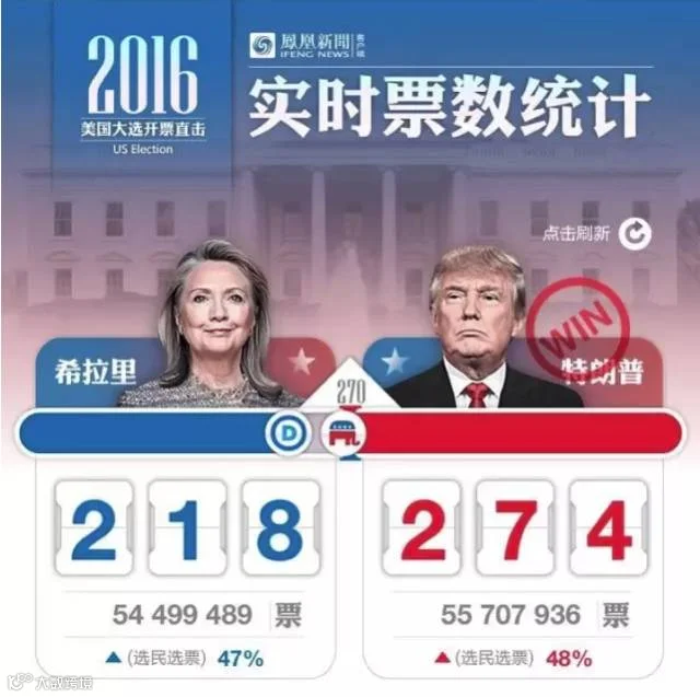 特朗普凭借在关键州的超预期表现,一举锁定当选美国总统所需的270张选举人票。