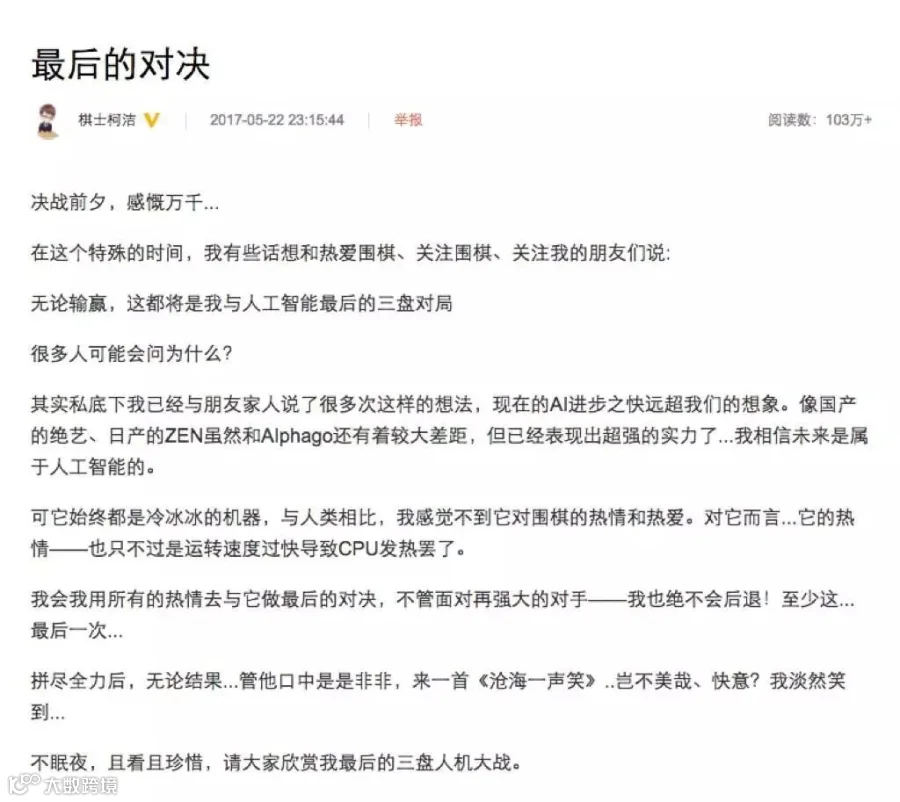 就在昨天晚上,柯洁在新浪微博发表了题为《最后的对决》的赛前宣言,不无伤感地提到: