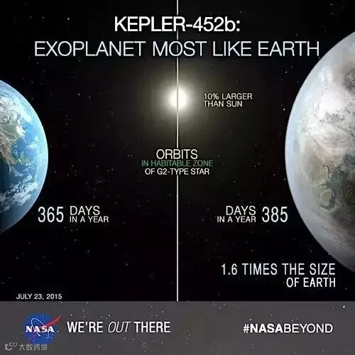 北京时间24日凌晨零点,NASA美国宇航局宣布人类发现了“另一个地球”,太阳系外行星——Kepler 452b,仿佛孪生姊妹一般,她和地球的相似指数达到了0.98!非常接近人类梦寐以求的宜居星球。一想到,在这浩瀚的星空中,是否有一个平行的世界,会不会也有着我们同样容貌的人,在做着同样的事情,注视着我们的一切,就会感到莫名的温暖,以下关于孪生地球的6个tips,让你将这份感动持续一整天!
