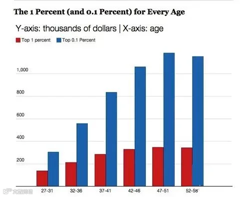 上图,蓝色柱状为每个年龄层顶端那0.1%人群的平均收入,红色柱状为每个年龄层1%人群的收入情况(点击图片可放大)。
