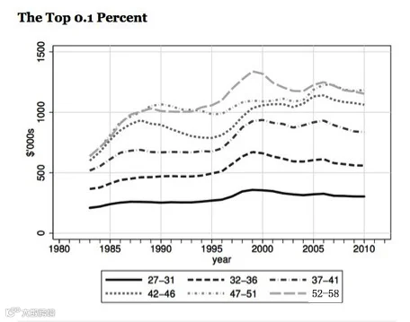 下图显示了不同年龄阶段,收入最高的1%、甚至每个年龄层最顶层0.1%人群的收入情况,根据统计,想要成为顶端收入者,首先平均年龄大概要到40岁以上。