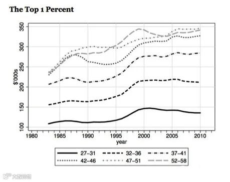 图片显示,想要在不同年龄段都保持成为1%的人群其实并不容易。2010年,一位年薪13万美金的30岁人士到了35岁需要每年挣到21万美金,而到了45岁,就要挣到28万美金一年才能保持这个位置。