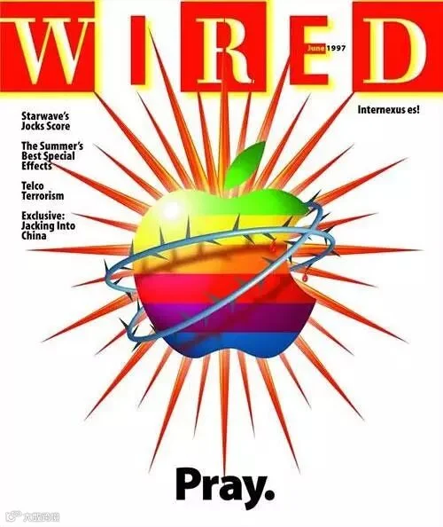 1997年6月的《Wired》封面是被带刺的铁丝缠住的苹果公司的Logo,下面只写了一个字“Pray”(祈祷)。在杂志中“101种拯救苹果的方式”的报道中,讨论如何挽救曾经辉煌一时的苹果公司的颓势。Steve Jobs和Steven Wozniak于1976年就创立了苹果电脑公司,并推出第一代苹果电脑。然而到了1997年,苹果在同行的激烈竞争中受挫,并经历着严峻的经济考验。自那时起,苹果公司的东山再起,部分归功于iPod的巨大成功。怎么样,现在回过头看1997年的杂志观点是不是很有意思,谁能想到现在苹果公司如此呼风唤雨了呢?
