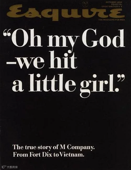 封面的标题是一句越战士兵的话:“Oh My God - We Hit a Little Girl.”(上帝啊,我们打中了一个小女孩),作者John Sack,是《Esquire》的随军记者,跟随一个刚到越南战场的步兵师参加第一场战斗。这篇3万3千字的文章,迄今保持着《Esquire》最长文章的记录。