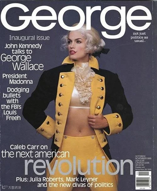 创刊号封面,超模辛迪·克劳馥扮成乔治·华盛顿的形象。《George》由John F.Kennedy Jr创办,内容涵盖政治,时事,流行文化,名流新闻等。1999年,Kennedy肯尼迪坠机身亡,杂志也在2001年3月停了刊。