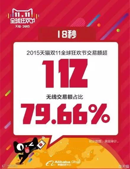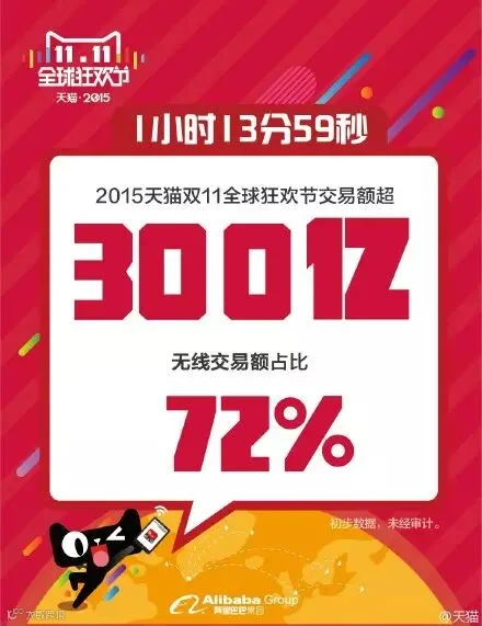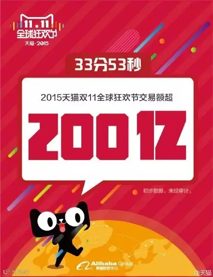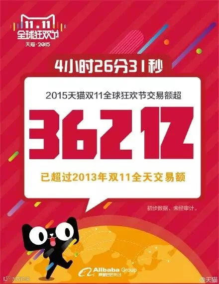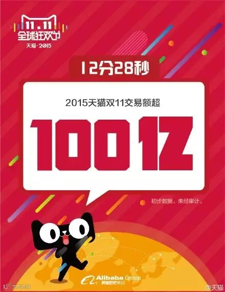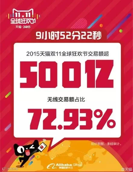 最新数据:9小时52分22秒,2015天猫双11全球狂欢节交易额超500亿,距离去年双11天猫全天销售总额571亿只有一步之遥!