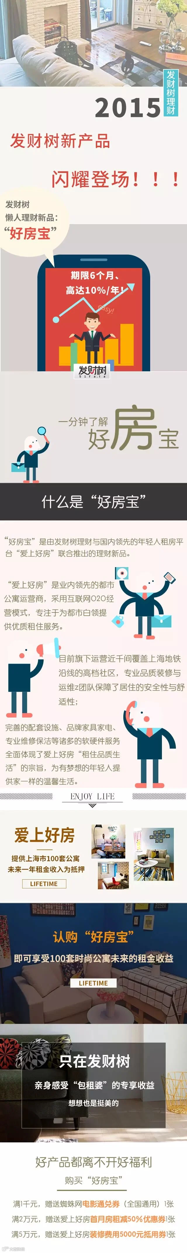 发财树理财新品“好房宝”于2015年10月29日正式上线!年化收益高达10%!更有电影通兑券、爱上好房装修费抵用券等多重好礼!