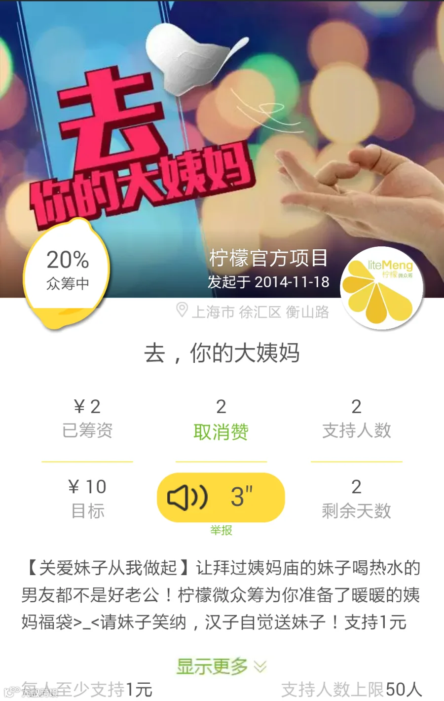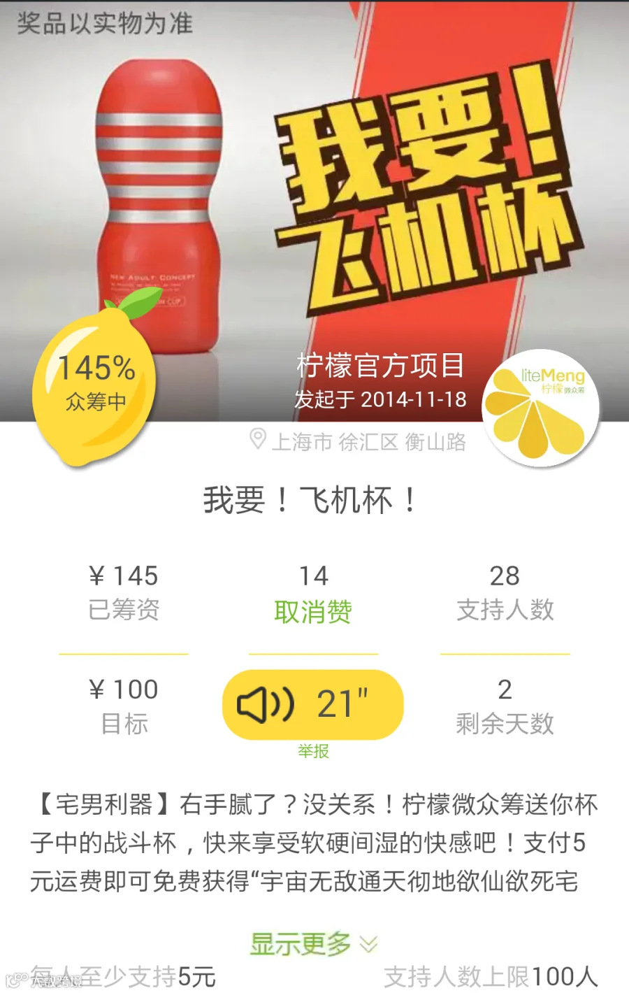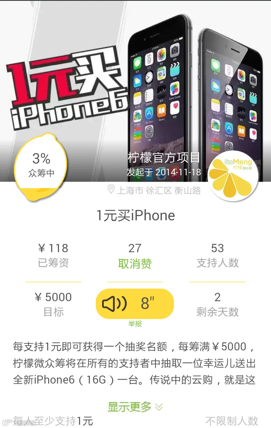 柠檬微众筹(截止本周日)发起一元众筹项目,支持一元即可参与抽奖。姨妈套装、飞机杯、电影票还有iphone 6就在不远处静静地看着你哦~。