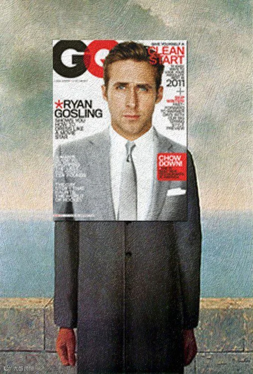 好莱坞性感男星瑞安高斯林Ryan Gosling的GQ杂志封面René Magritte的《 The Son of Man》