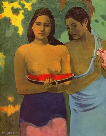 因《变形金刚》走红的性感女星梅根·福克斯的GQ杂志封面混入Paul Gauguin的《两个塔希提妇女》