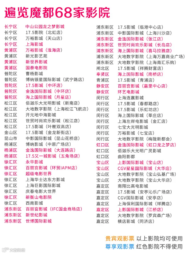 影院包含:百丽宫(环贸IAPM店)、百丽宫(IFC国金店)、上海影城、万裕影城(淮海店)、国泰电影院、新衡山电影院等在内的68家影院。