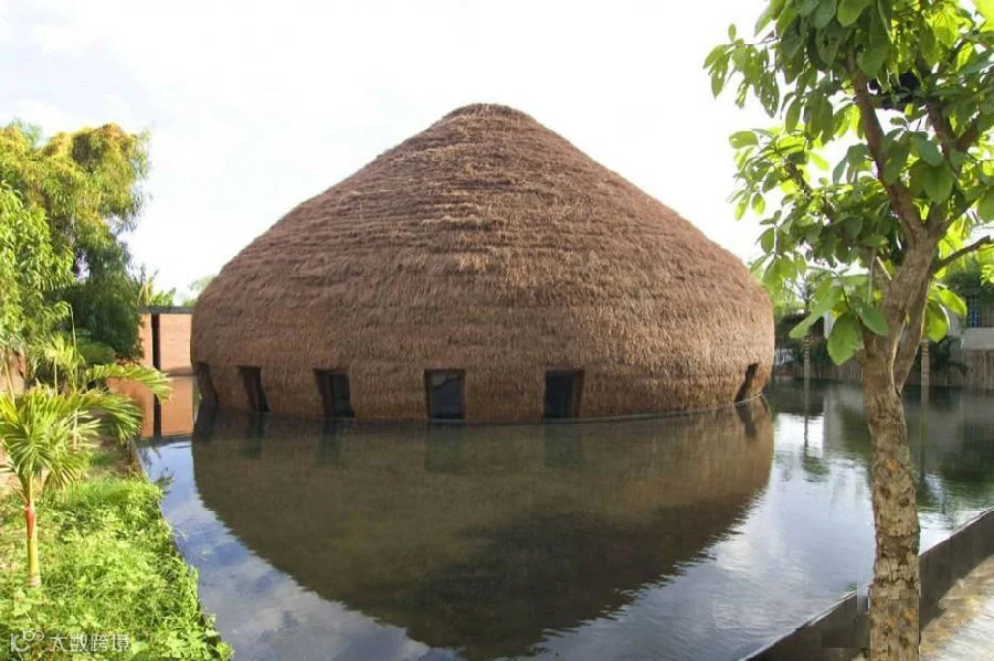 酒吧与当地的水元素进行了很好地映衬结合,沿着石头路就能走到巨大的茅草屋中,房屋四周茅草被温暖的灯光点亮,营造了极其舒适温馨的环境,再品上两杯酒就更加完美了。