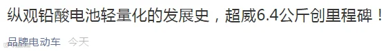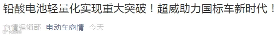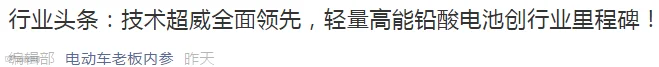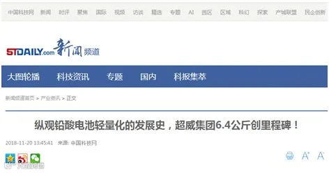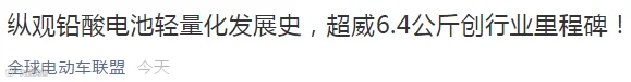 近日,中国科技网、中国科学网等国内权威媒体重磅报道了铅酸领域最新突破——《纵观铅酸电池轻量化的发展史,超威6.4公斤创里程碑!》,中科院院士明确表示高比能技术是铅酸未来唯一趋势,提高科技含量才是铅酸升级之道。而且以后废电瓶也不再可能有折旧作用进行新电池的以旧换新模式了(详情参见《铅酸变天,废电池不再卖钱!环保新规最高罚100万!各地停收,被抓判刑!》)!