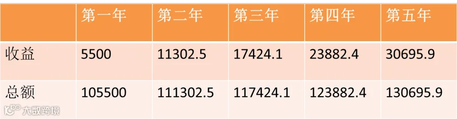 如果您购买银行发行的理财产品,还是以5年期计算,取年化利率5.5%,则五年后一共获得收益3万余元。