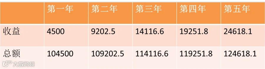 如果您正使用“余额宝”,同样的期限,即使利率按照年化4.5%年化计算,则一年后获得收益4500元,五年总额为124618.1元,一共获得收益2.4万余元。