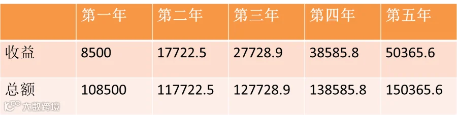 当你购买中正财富私募基金理财产品时,即使只按照年化利率8.5%计算,同样的低风险、固定收益条件下,五年后一共获得收益5万余元。