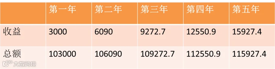 假设你有10万元,5年时间,即使按照降息前3%的一年期定期存款利率,复利计算:存银行一年获得利息3000元,第二年获得6090元,五年后总额为115927.4元,一共获得利息1.5万余元。
