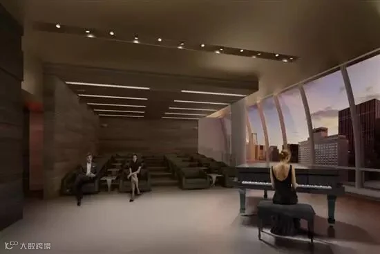 在休闲区一层还有一个可以用来观影或是表演的房间,配有20个椅子。同时在这里也能看到城市全景。