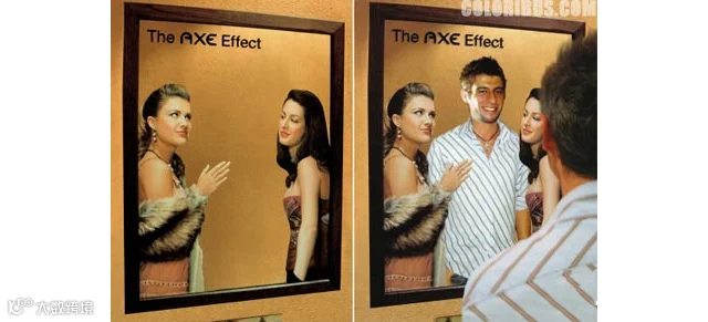 当男士们路过此面镜子广告时,就会看见自己左右逢源啦!这就是AXE男士护肤品的功效。