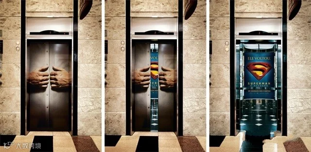 这个创意好赞!等待电梯开门的瞬间,我们就站在超人的衬衫和紧身衣之间呢。