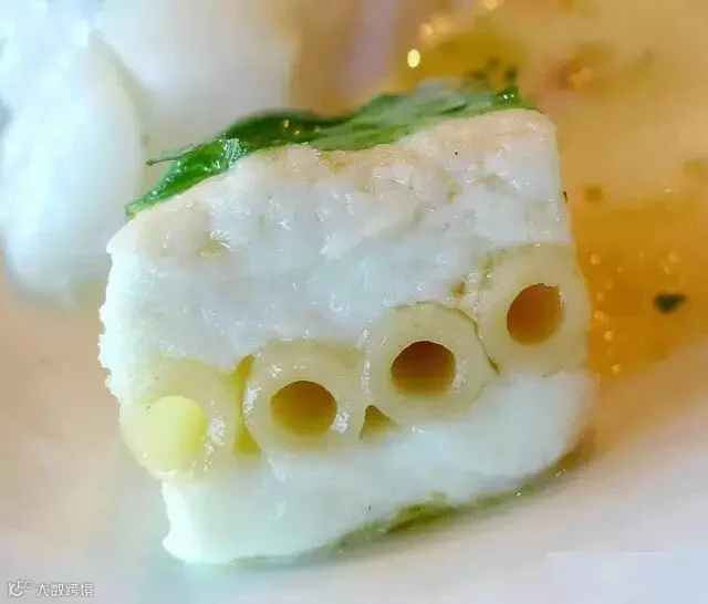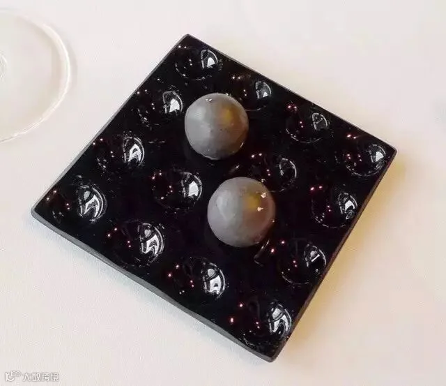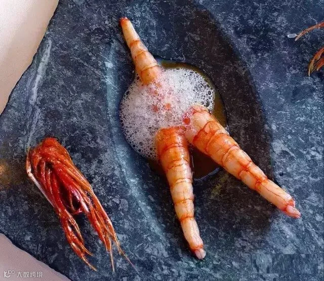 这是烤虾搭配空气藻类,如此装扮就像是石板上的浮游生物。