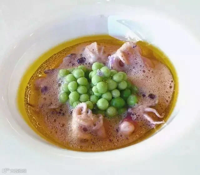 菜单上的第二道菜是香肠、章鱼搭配豌豆。章鱼肉质很嫩,正好和肉汤上的豌豆相搭配。