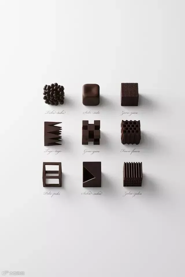 团队甚至为这9款巧克力分别取了名字,以描述纹理的日文命名,显得俏皮可爱,让食用者又多了一份口感体验。