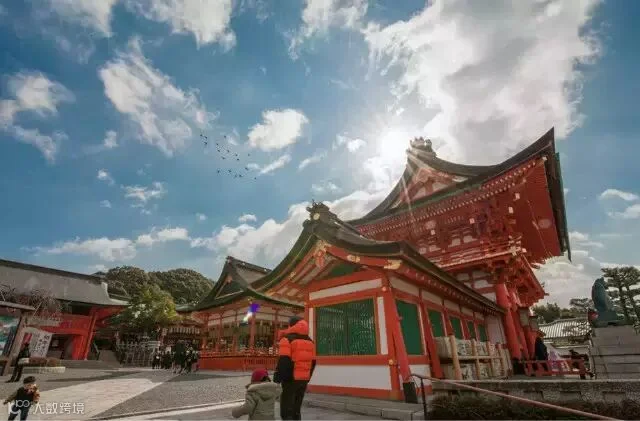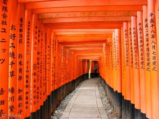 在伏见稻荷大社漫山遍野的是橙色的千鸟居,和绿色的山形成了鲜明的对比,分成几排从山脚一直排列到山顶,全程约4公里,步行到山顶来回大约需要2-3个小时。