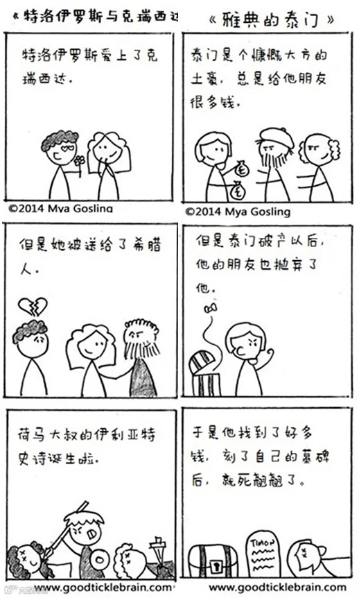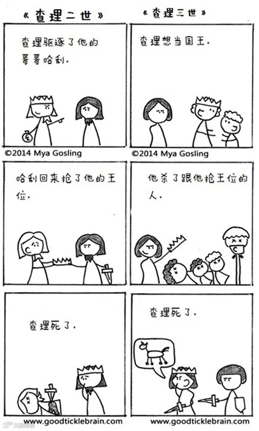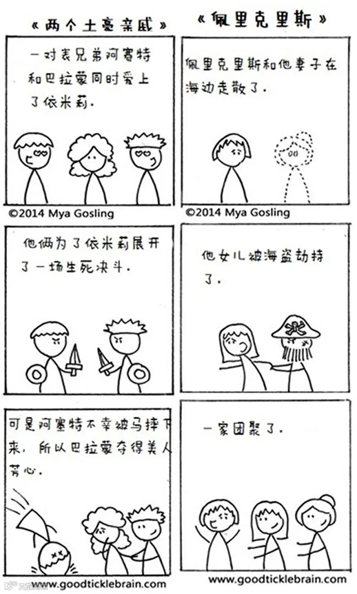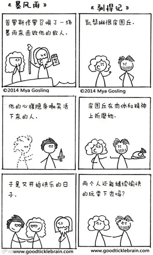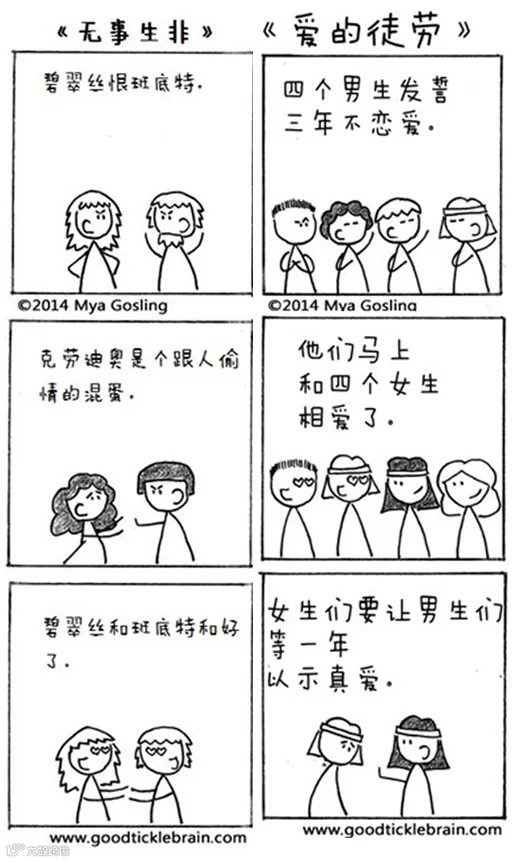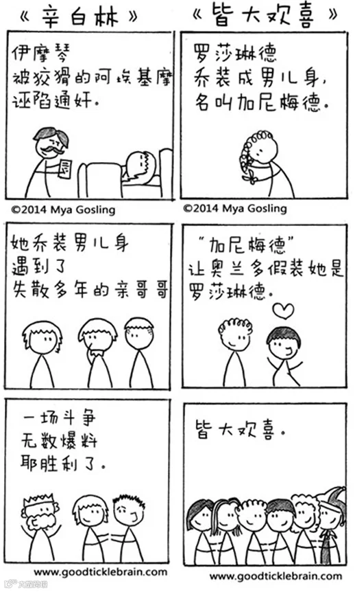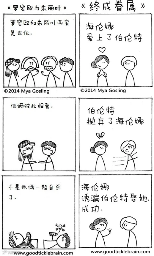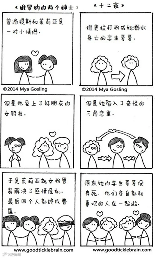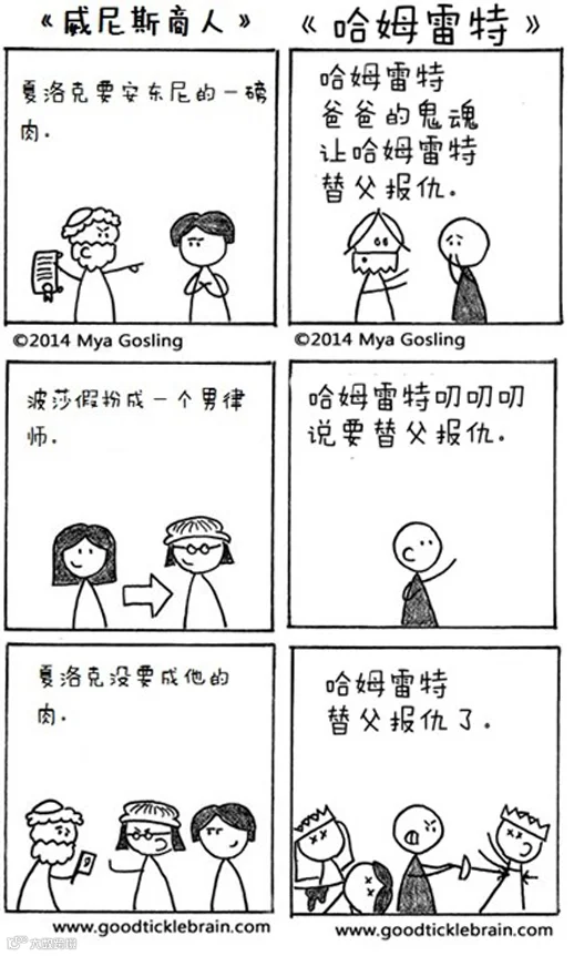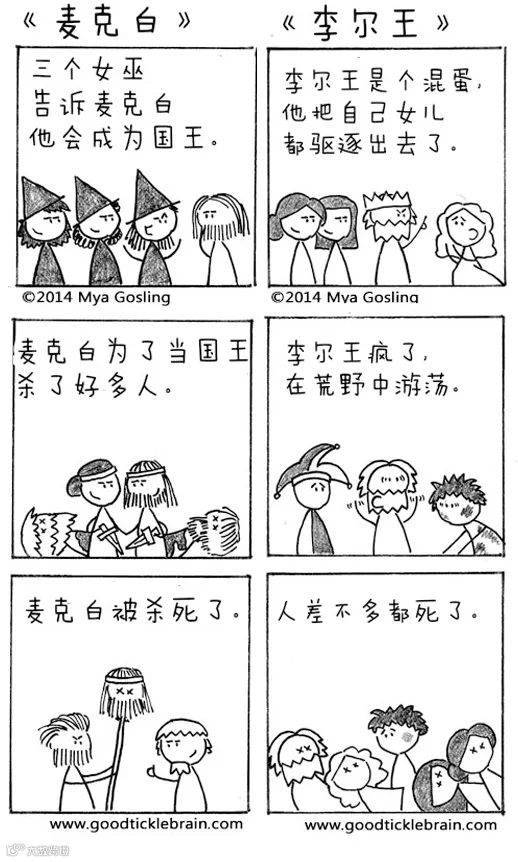 当然,名著之所以被称为名著,光看漫画自然是不够的,漫画的作用其实是作为引子,抛砖引玉,吸引大家去阅读原著,体会真正的文学艺术,虽然都被我剧透得差不多了~~!下图每排横着放了两部莎翁作品,每部作品请大家竖着往下看,都是3幅漫画搞定!