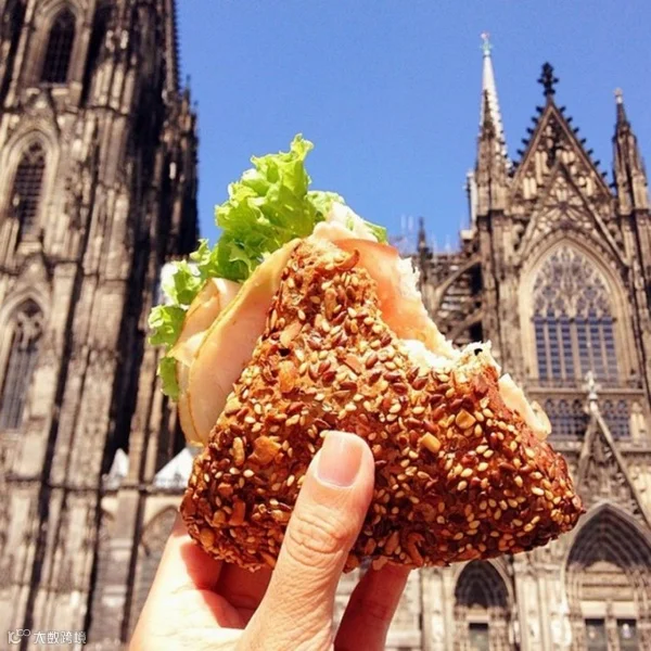 德国科隆 Melissa在宏伟的科隆主教座堂前高举起手中的粗粮麵包三文治!