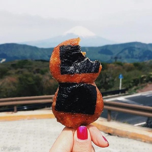 日本箱根大涌的甜烤年糕(Agedango)。 远处就是富士山啦。