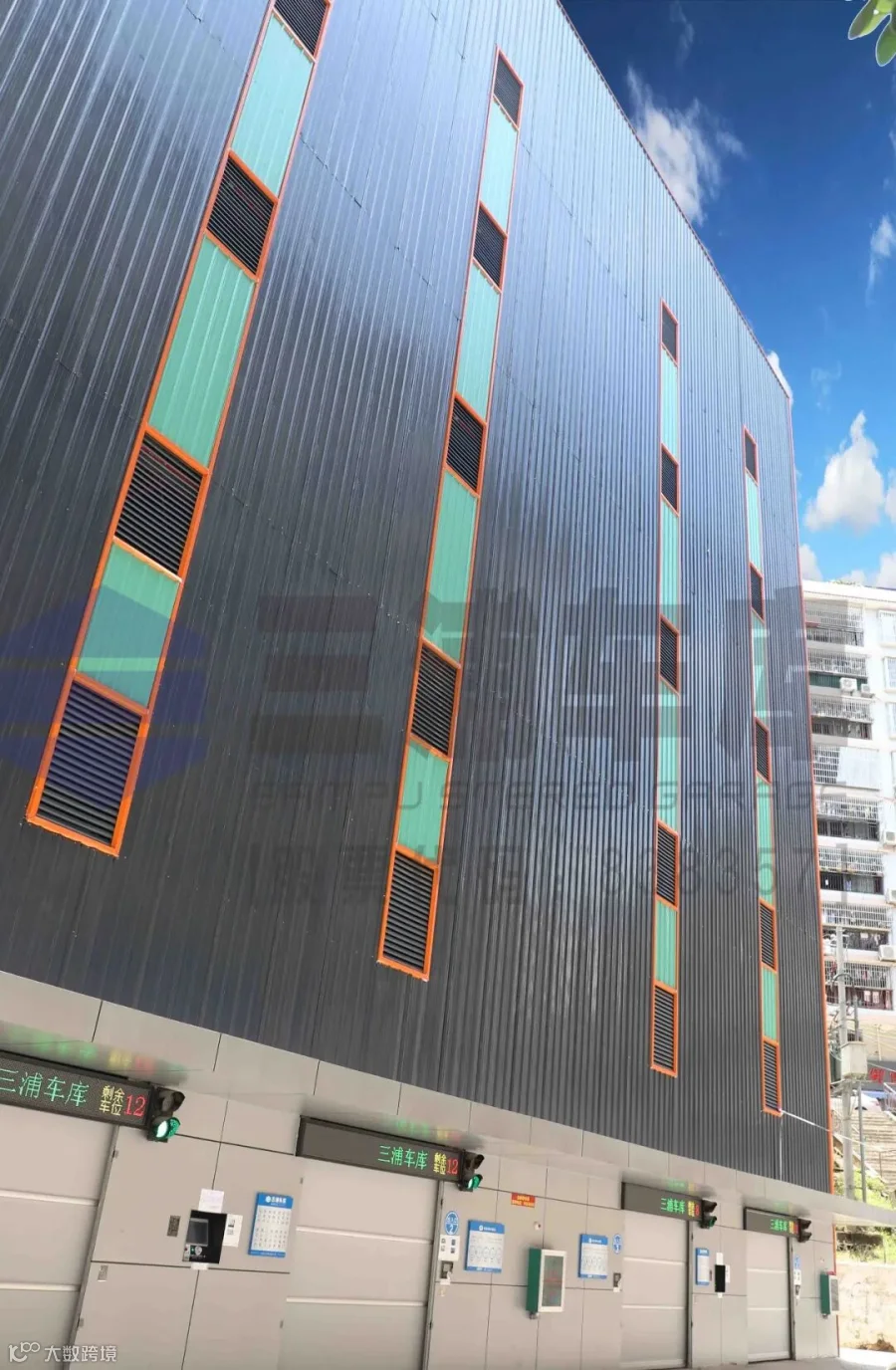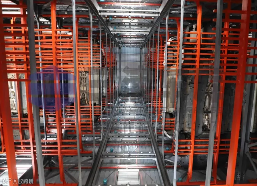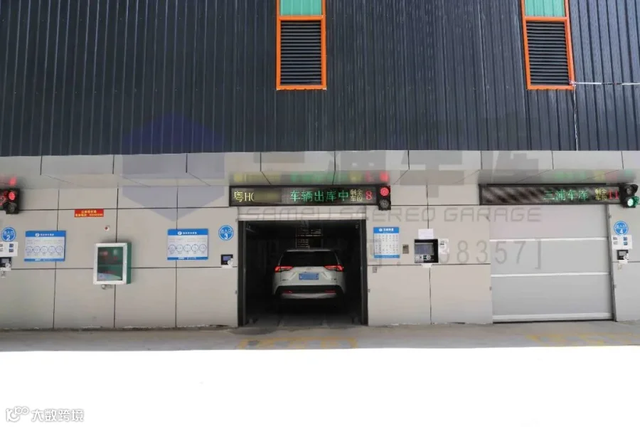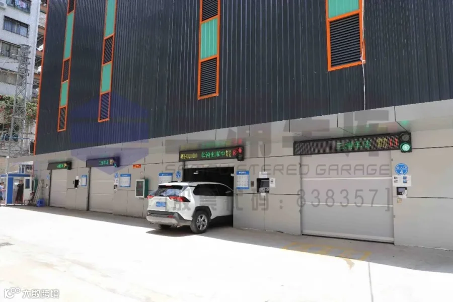 出入口:停车库共十一层,每层都设有一台横移搬运车。共4个出入口;设有4台升降机;