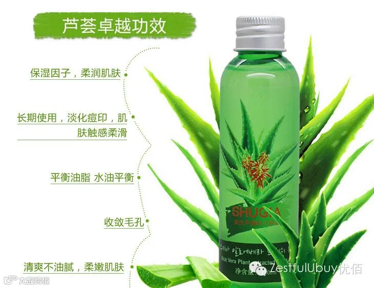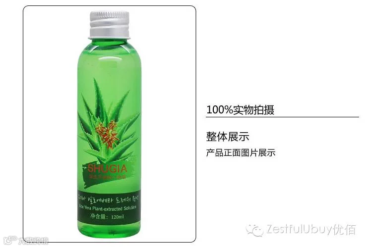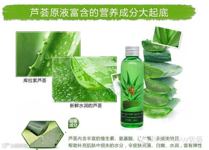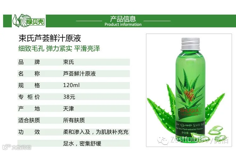 产品功效:饱含芦荟中的新鲜汁液,质感舒适无粘腻感,柔和渗入肌肤,为肌肤补充充足水分,集舒缓、保湿、平滑、亮泽、紧实、细致毛孔、弹力、修护多重功效于一体,重现细滑莹润光彩美肌.配合束氏芦荟凝胶系列产品使用效果更好.
